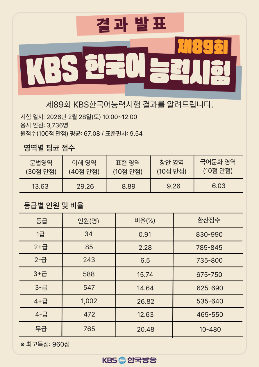 1. 2026년 2월 28() 3,736명이 응시한 제89회 KBS한국어능력시험의 원점수 평균은 100점 만점에 67.08표준편차는 9.54로 나타났습니다.
